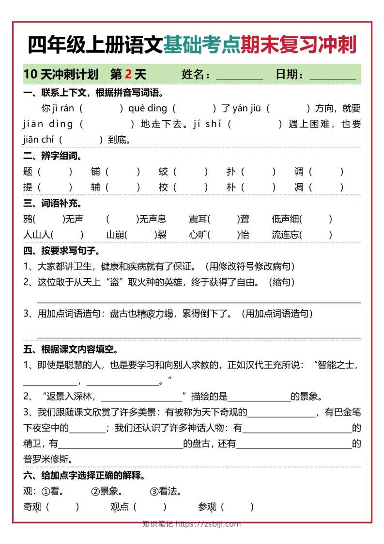 四年级上语文基础考点期末复习冲刺10天知识笔记2个月前发布关注私信04511四年级上语文基础考点期末复习冲刺10天此内容为付费资源,请付费后查看¥9.2¥19.9黄金会员免费钻石会员免费立即购买您当前未登录!建议登陆后购买,可保存购买订单格式pdf页数20 页大小5.42 MB付费资源 ------预览已结束,还剩18页未读------开通会员后可免费下载高清完整文档 © 版权声明文章版权归作者所有,未经允许请勿转载。THE END小学语文 喜欢就支持一下吧点赞11 分享QQ空间微博QQ好友海报分享复制链接收藏